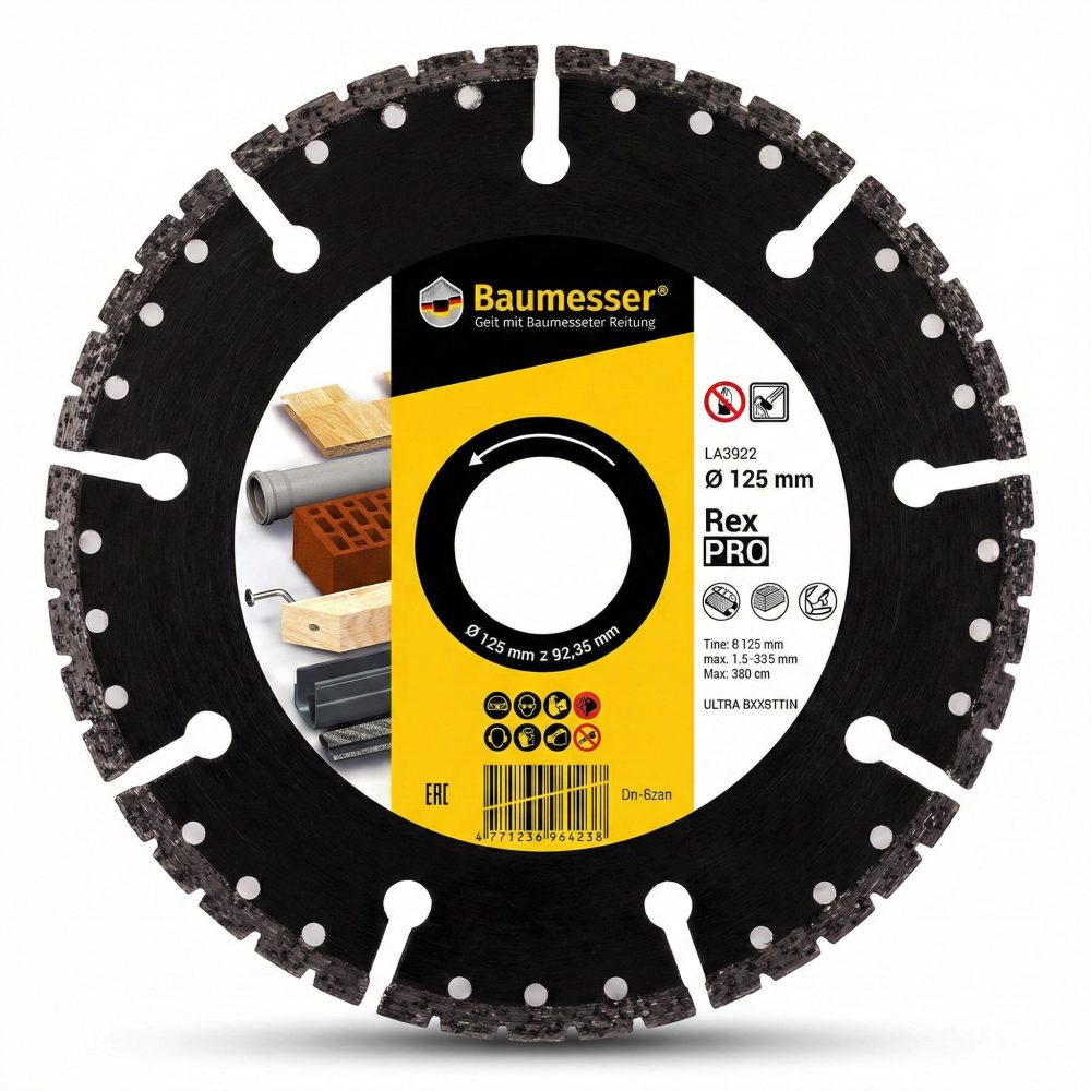 PRO REX 1A1RSS je diamantna rezilna plošča premera 125 mm z izvrtino 22,23 mm, namenjena uporabi na kotnih brusilkah. Zasnovana je za učinkovito rezanje različnih gradbenih materialov, kot so beton, opeka, zidaki in podobni mineralni materiali (odvisno od izvedbe). Segmentirana oblika poskrbi za dobro hlajenje in hitro odvajanje materiala, kar omogoča hitrejši rez in stabilno delovanje pri zahtevnejšem delu.
