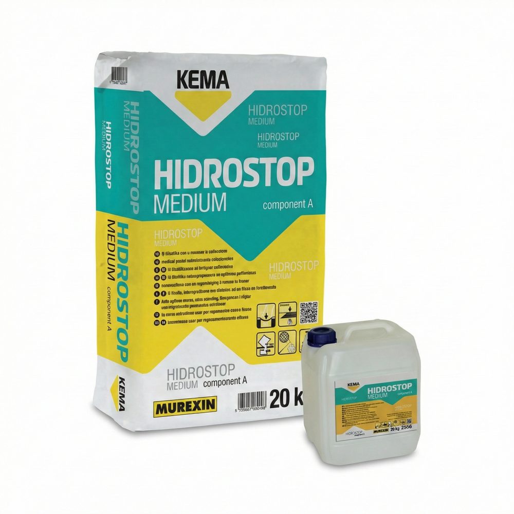 KEMA Hidrostop Medium je dvokomponentna, fleksibilna cementno vezana masa za vodotesno zaščito betona in drugih primernih podlag. Namenjena je notranji in zunanji uporabi, kjer potrebuješ zanesljivo zaščito pred vodo in vlago. Primerna je tudi za strojni nanos (airless) in pri uporabi alkalno odporne steklene mrežice omogoča tesnjenje tudi na podlagah, ki so izpostavljene krčenju in raztezanju. Izdelek je skladen z EN 1504-2.