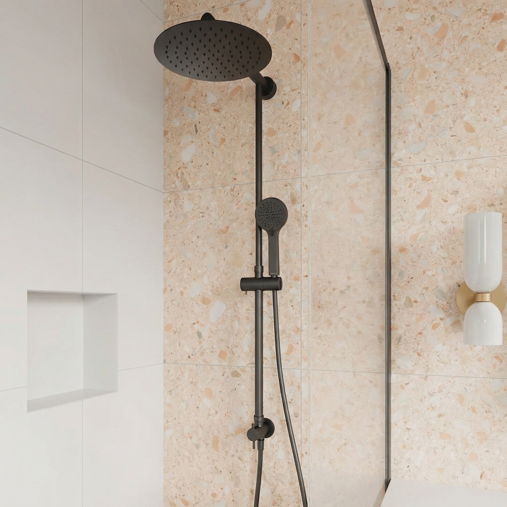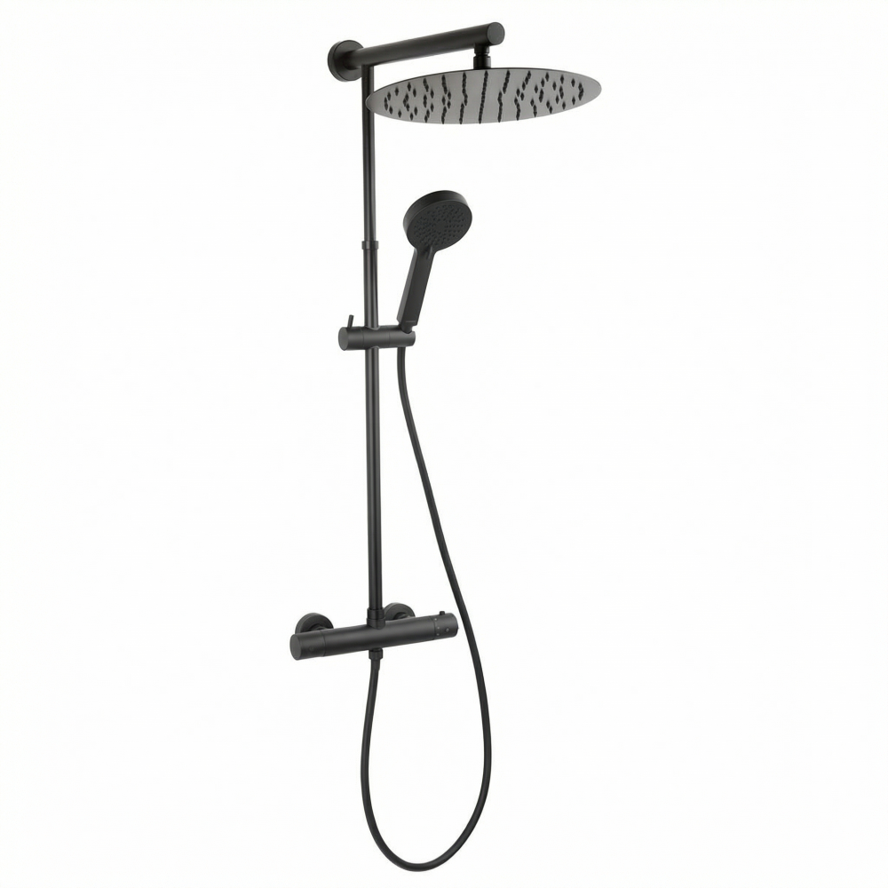 Trevi tuš sistem v črni barvi vključuje nadglavno SLIM prho, ročno prho in termostatsko armaturo za stensko montažo. Kovinska dvižna palica ima nastavljivo dolžino 800 do 1250 mm ter nastavljivo višino montaže. Nadglavna prha iz nerjavnega jekla ima premer 300 mm, kot pršne plošče se nastavlja preko kroglastega zgloba. Sistem Easy Clean omogoča enostavno odstranjevanje vodnega kamna.