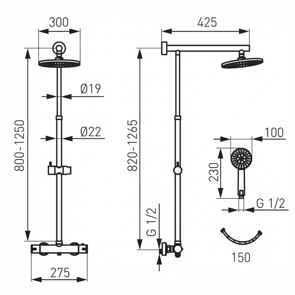 Termostatska armatura ima varnostno zaporo pri 38°C in vgrajen keramični preklop med nadglavno in ročno prho. Priključna razdalja je 150 ± 20 mm preko ekscentrov. Priključek za nadglavno prho je G3/4 zgoraj, priključek za ročno prho je G1/2 spodaj.