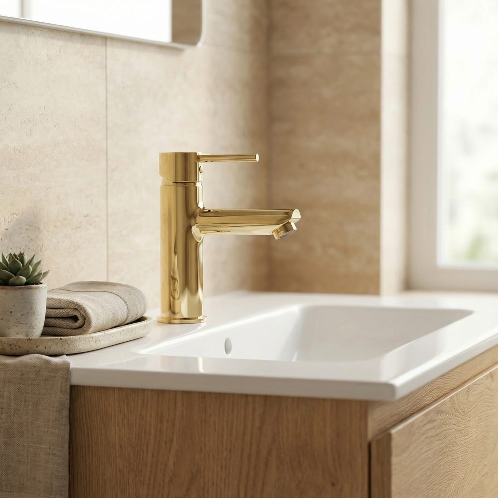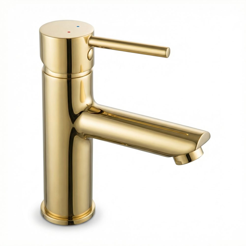 Kakovostna umivalniška armatura v sijoči zlati izvedbi.