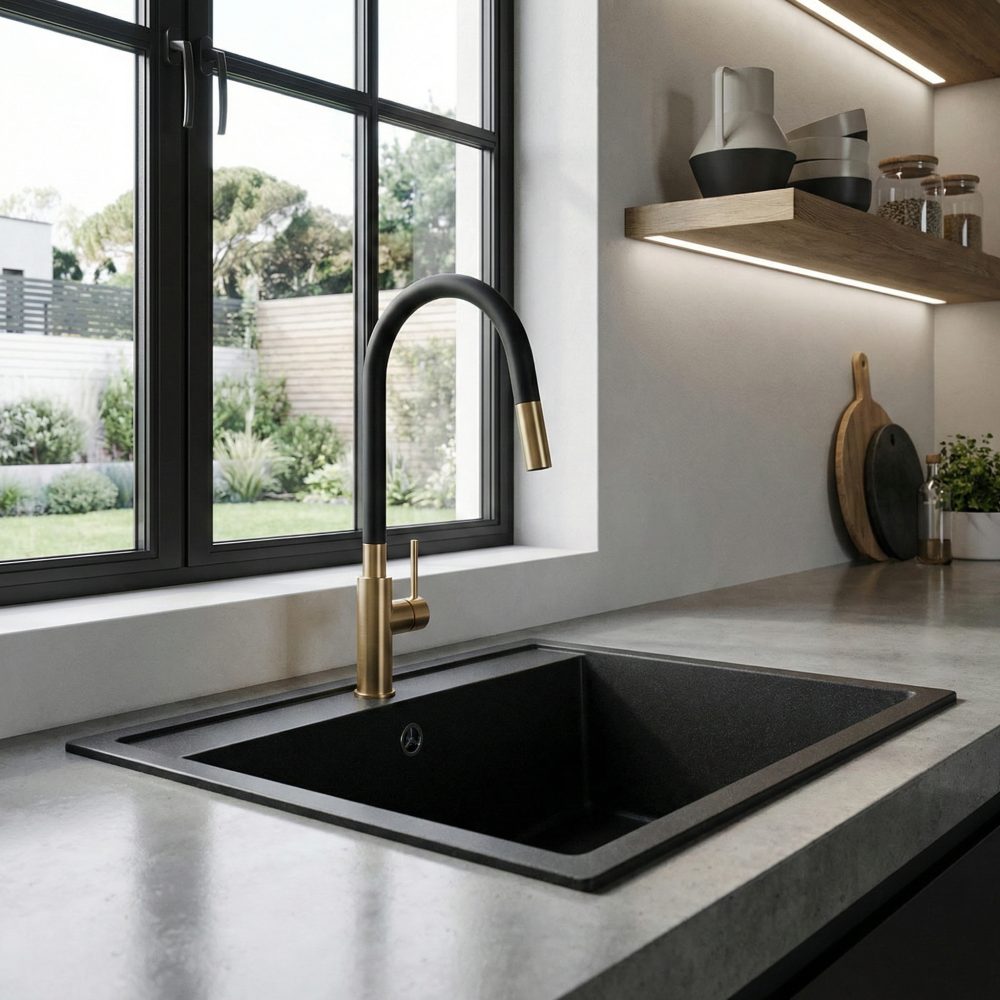 Kakovostna kuhinjska armatura s prilagodljivim izlivom.