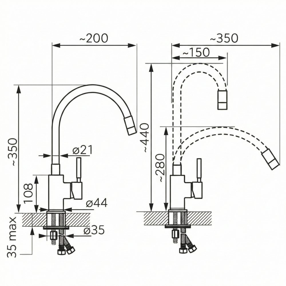 • Spremenljiv doseg izliva: 150–350 mm