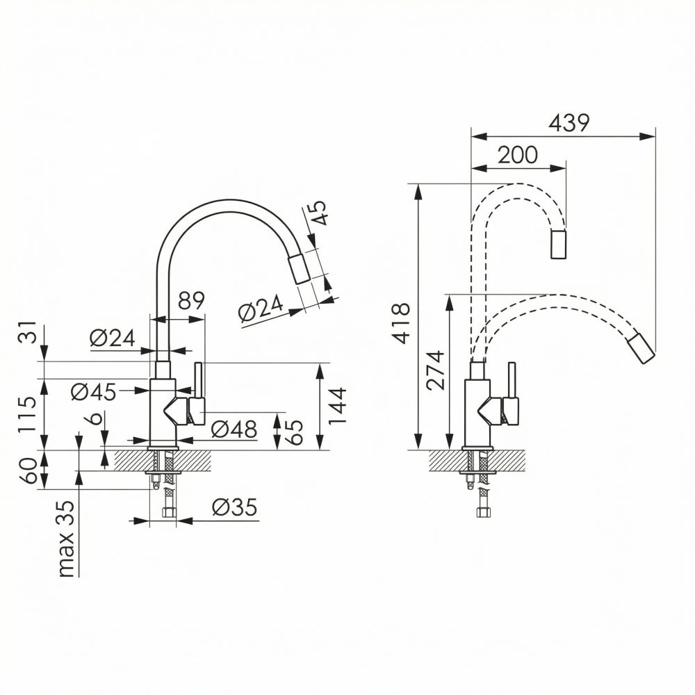 • Spremenljiv doseg izliva: 150–350 mm