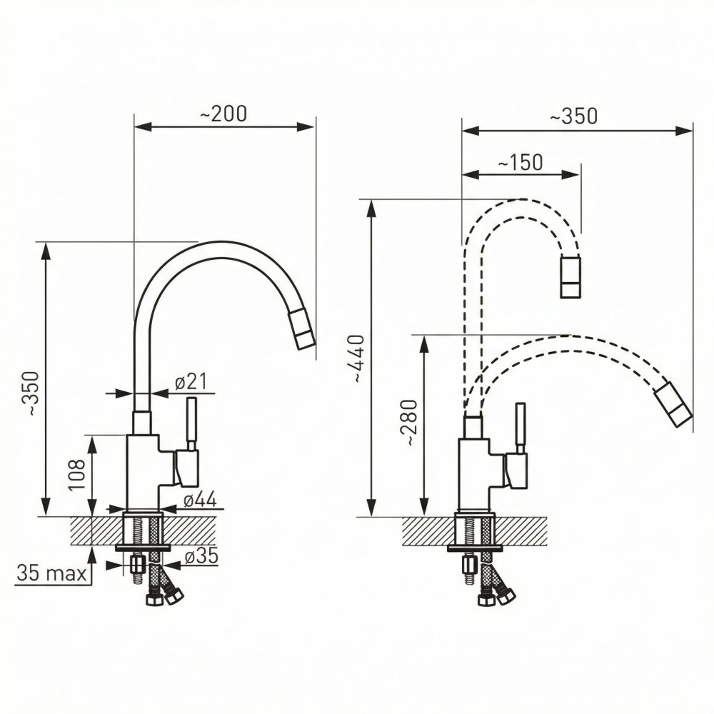 Spremenljiv doseg izliva: 150–350 mm