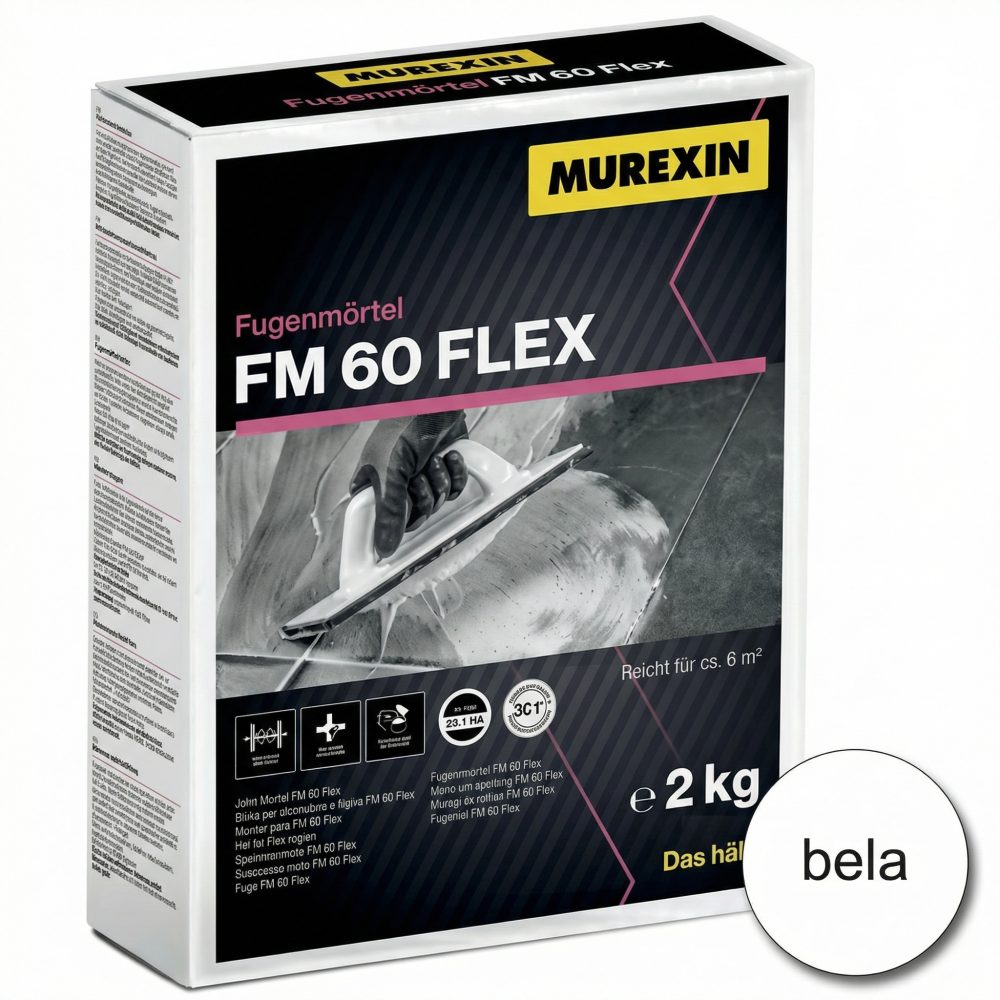 Murexin FM 60 Flex je praškasta, fleksibilna fugirna masa z efektom kapličenja (vodoodbojnost) za fugiranje keramičnih oblog, kamnitih plošč in mozaika na stenah in tleh. Primerna je za notranjo in zunanjo uporabo, tudi za terase, balkone, vlažne prostore ter talno gretje. Nizka absorpcija vode pomaga preprečevati flekavost in madeže po sušenju.