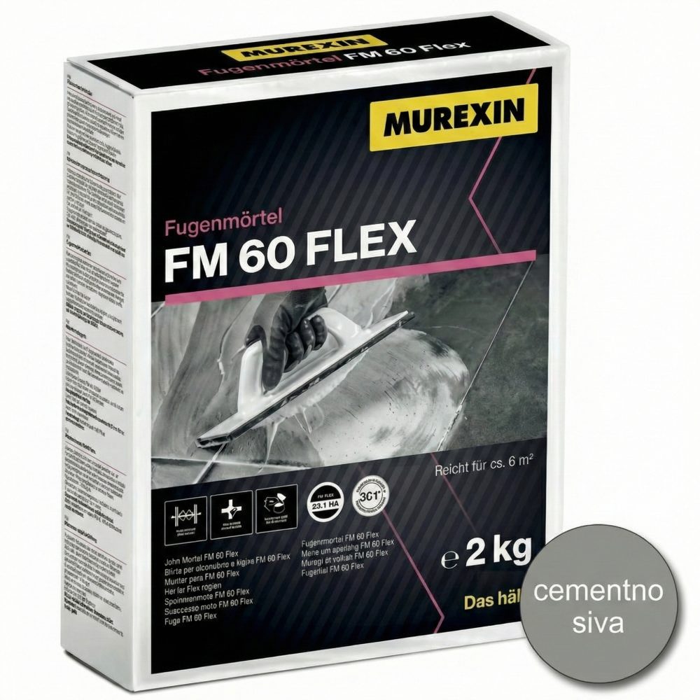Murexin FM 60 Flex je praškasta, fleksibilna fugirna masa z efektom kapličenja (vodoodbojnost) za fugiranje keramičnih oblog, kamnitih plošč in mozaika na stenah in tleh. Primerna je za notranjo in zunanjo uporabo, tudi za terase, balkone, vlažne prostore ter talno gretje. Nizka absorpcija vode pomaga preprečevati flekavost in madeže po sušenju.