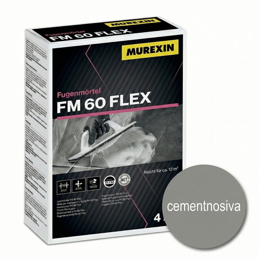 Murexin FM 60 Flex je praškasta, fleksibilna fugirna masa z efektom kapličenja (vodoodbojnost), za fugiranje keramičnih oblog, kamnitih plošč in mozaika na stenah in tleh. Primerna je za notranjo in zunanjo uporabo, tudi za terase, balkone ter podlage s talnim gretjem. Nizka absorpcija vode pomaga preprečevati flekavost in madeže po sušenju.