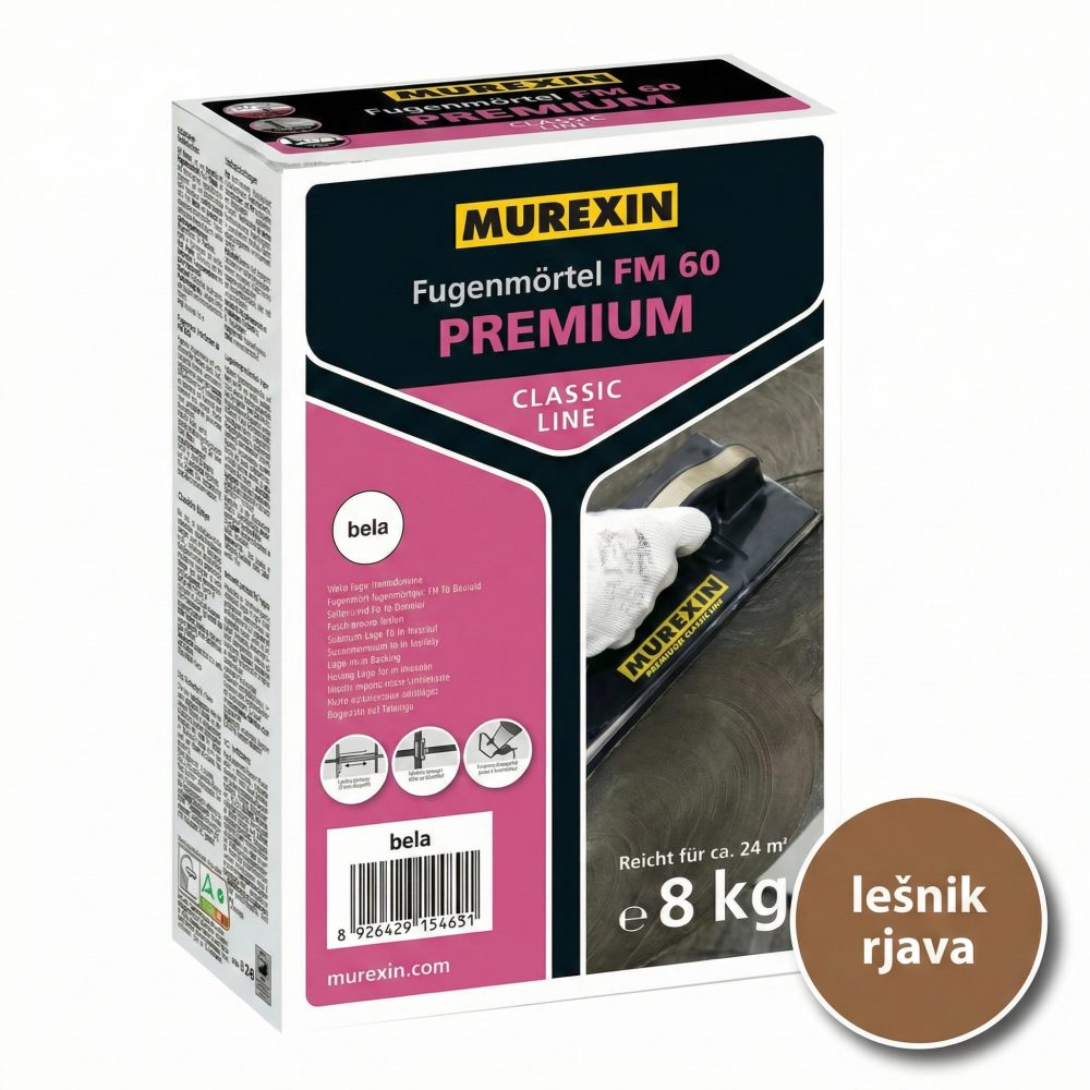 Murexin FM 60 Premium je praškasta, fleksibilna fugirna masa z efektom kapličenja (vodoodbojnost), namenjena fugiranju keramičnih oblog, mozaika in kamnitih plošč na stenah in tleh. Primerna je za notranjo in zunanjo uporabo, tudi za terase in balkone, ter za prostore z višjo vlago. Nizka absorpcija vode pomaga zmanjšati flekavost po sušenju.