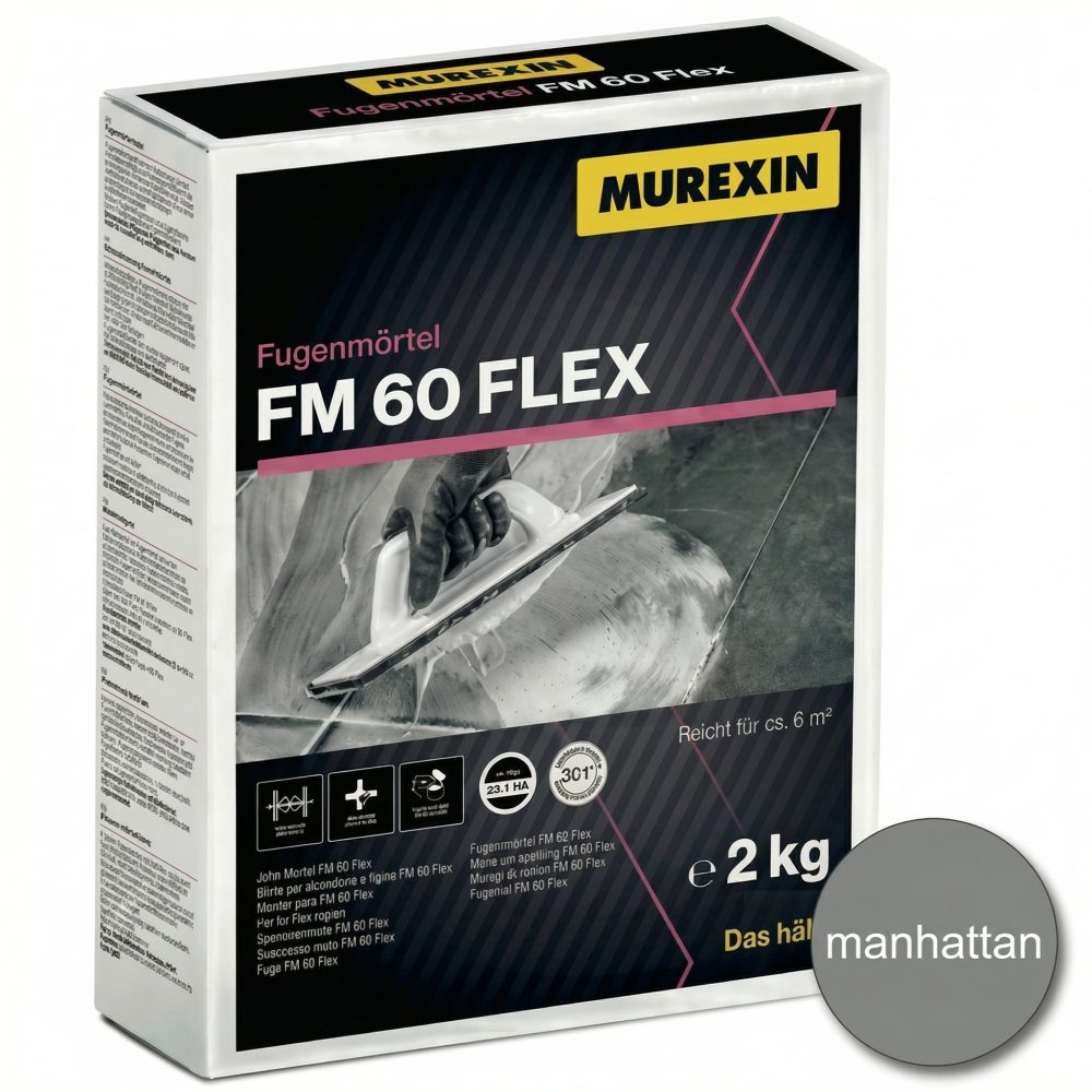Murexin FM 60 Flex je praškasta, fleksibilna fugirna masa z efektom kapličenja (vodoodbojnost) za fugiranje keramičnih oblog, kamnitih plošč in mozaika na stenah in tleh. Primerna je za notranjo in zunanjo uporabo, tudi za terase, balkone, vlažne prostore ter talno gretje. Nizka absorpcija vode pomaga preprečevati flekavost in madeže po sušenju.