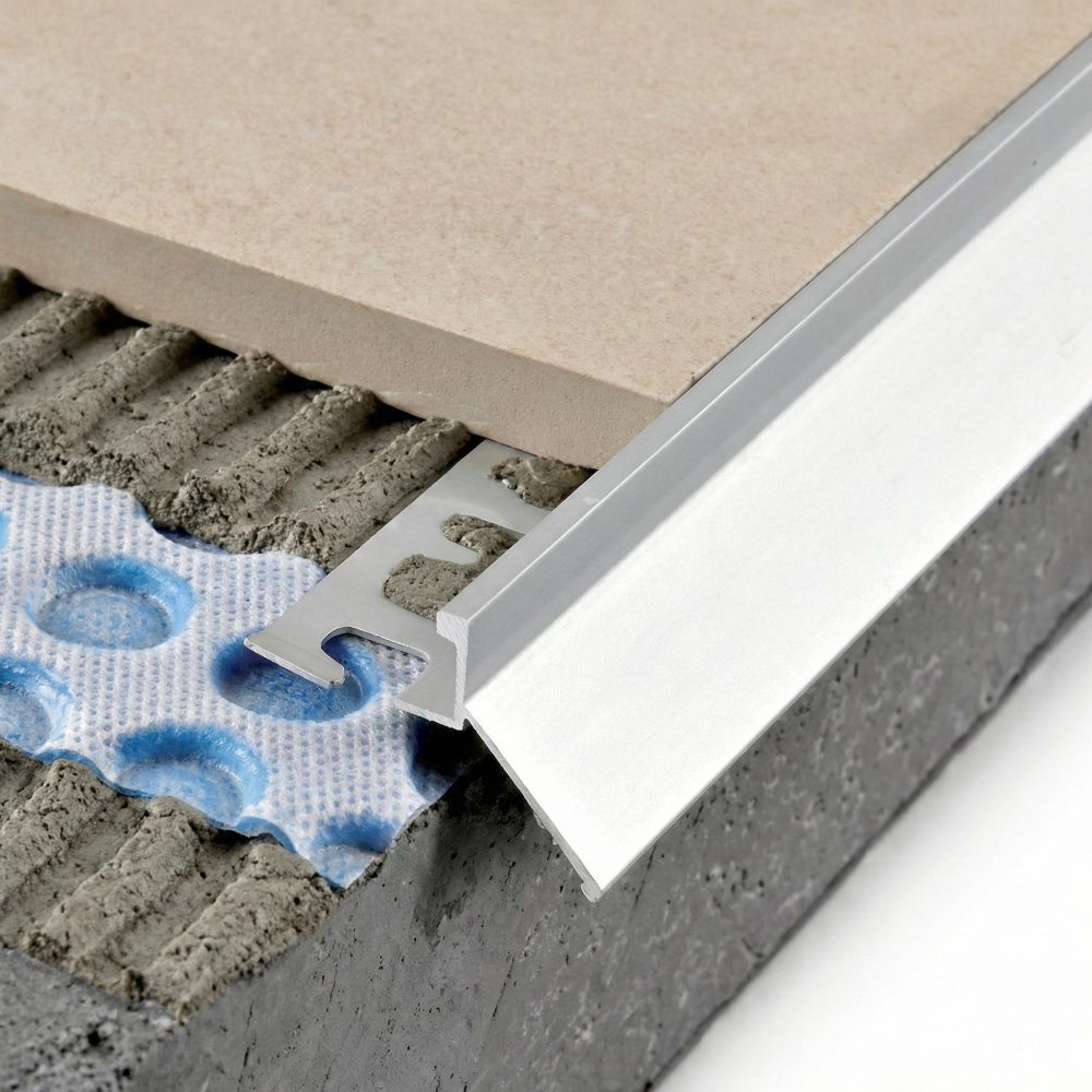 Aluminijast odkapni profil je zaključni profil za robove keramičnih oblog, ki usmeri vodo stran od fasade in preprečuje zatekanje po čelni strani. Uporablja se na balkonih, terasah in drugih zunanjih robovih, kjer želiš čist in trpežen zaključek ter zaščito roba ploščic. Profil se vgradi v lepilo pod oblogo, odkapni rob pa poskrbi za pravilno odvajanje vode.