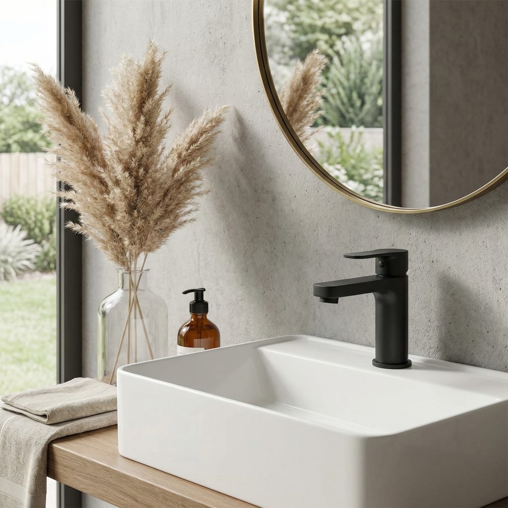 Vitto VerdeLine je stoječa, nizka umivalniška armatura v črni izvedbi.