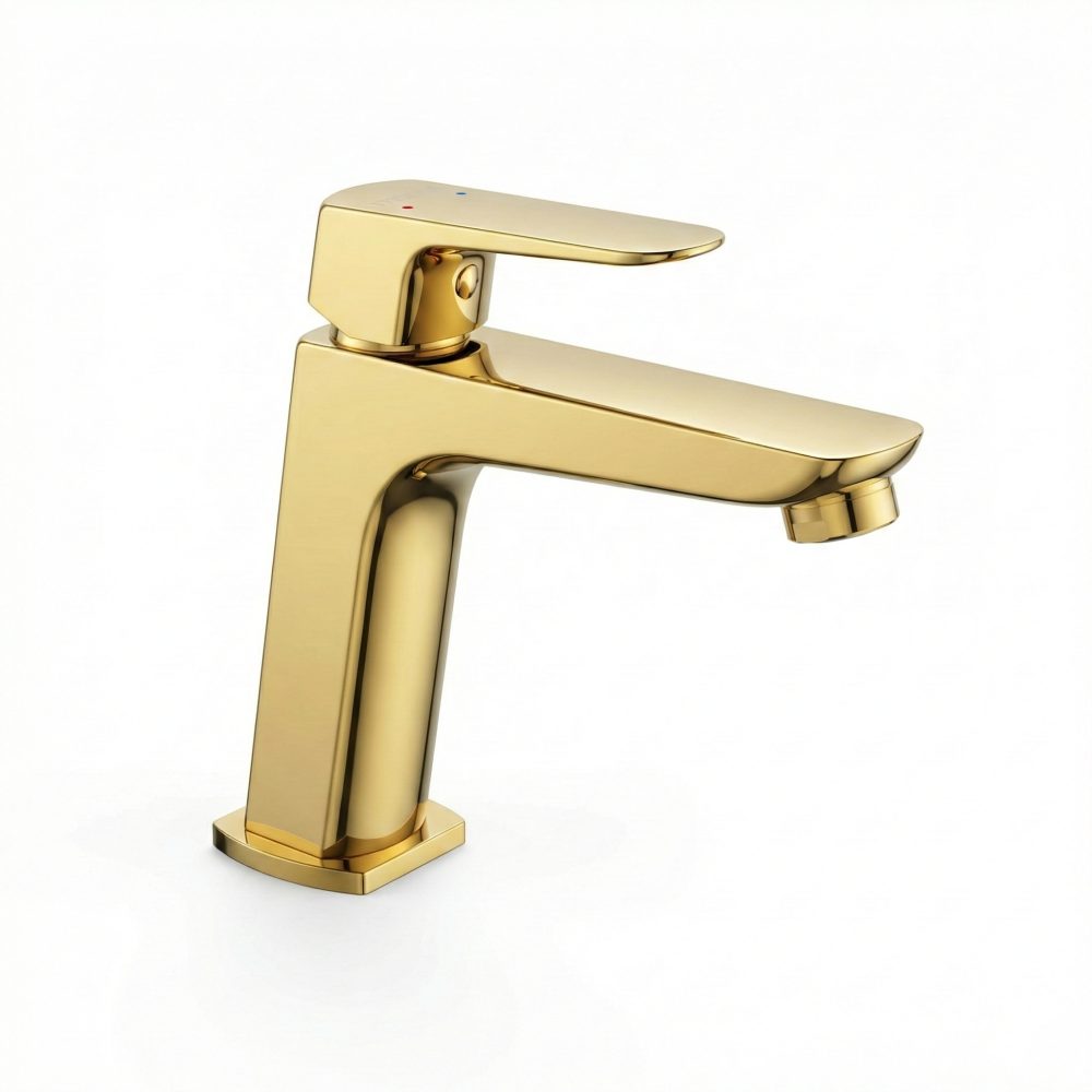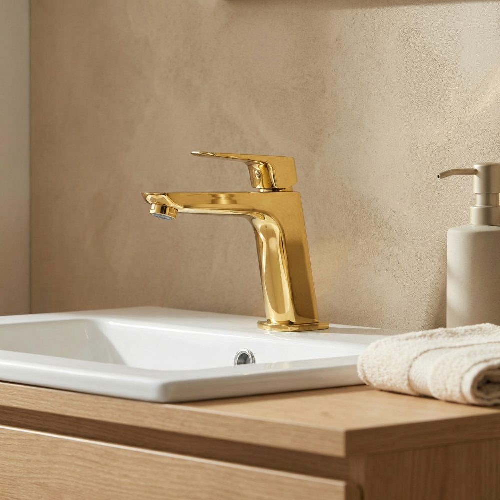 Vitto VerdeLine je stoječa, nizka umivalniška armatura v zlati izvedbi.