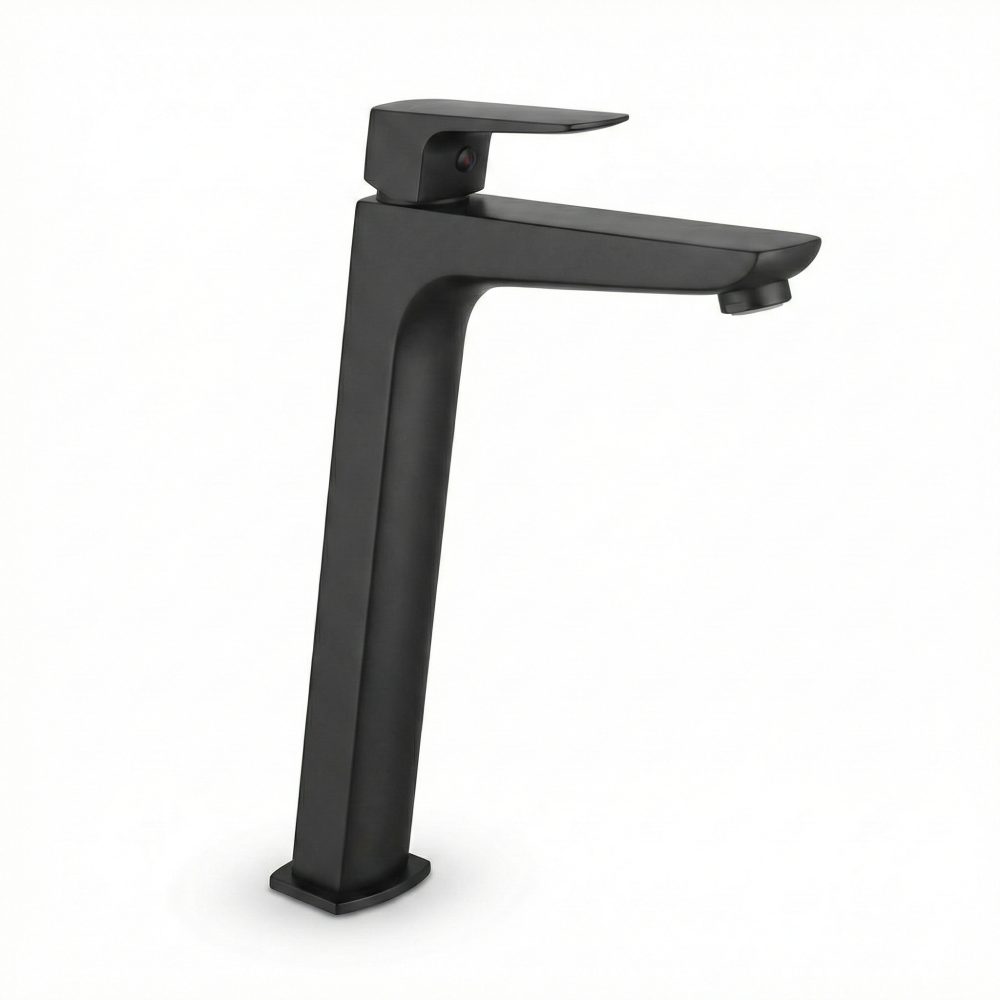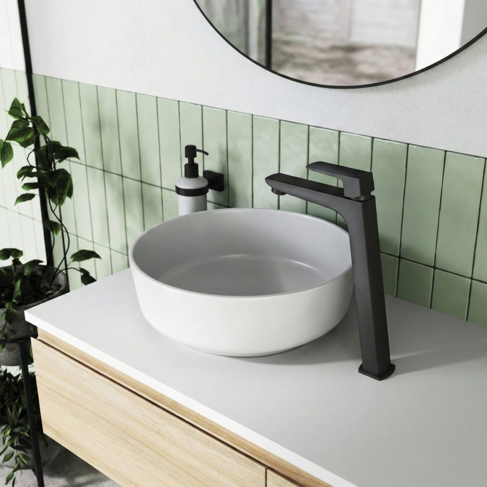 Kakovostna stoječa umivalniška armatura v črni izvedbi.