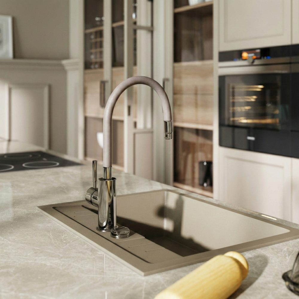 Opremljena je s keramičnim regulatorjem za zanesljivo in natančno delovanje ter je primerna za montažo na eno odprtino. Prilagodljiv izliv omogoča prosto oblikovanje, po potrebi pa je možna tudi menjava barve izliva. Nastavljiv doseg in višina izliva olajšata uporabo pri pomivanju in polnjenju posod. Za prijeten in varčen pretok skrbi regulator pretoka M22×1, priložene pa so tudi prožne priključne cevi za enostavno namestitev.